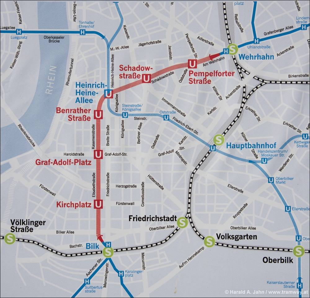 Die Stadtbahntunnels in Düsseldorf; rot die neue Wehrhahn-Linie
