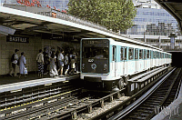 Nachdem die neue Technik einige Jahre getestet wurde entschied man sich, die kurze Linie 11 für den Einsatz der gummibereiften Fahrzeuge auszurüsten. Die dafür angeschaffte Type "MP55" verkehrte bis 1999 auf dieser Strecke. Die hier bestätigte generelle Tauglichkeit führte zum Bau der ähnlichen "MP59", die als Sechswagenzüge auf der als nächstes umgestellten Linie 1 eingesetzt wurden. Sie verkehren heute noch auf der Linie 11, das Bild zeigt einen Zug in der Station "Bastille" (die Wagen wurden allerdings Anfang der 90er Jahre modernisiert und erhielten auch ein neues Frontstyling). Nach der aufwendigen Umrüstung der Linien 1, 4 und 6 war allerdings Schluss - es war einfach zu teuer und zu schwierig, die stark befahrenen Linien während des laufenden Betriebes umzubauen, ausserdem hatte auch die klassische Rad/Schiene-Technik inzwischen Fortschritte gemacht.