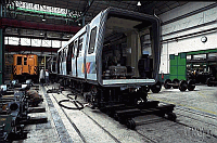 Die Fahrbetriebsmittel der Métro waren anfangs bemerkenswert einfach gestaltet. Eigenartigerweise nahm man an, dass sich die Pariser nicht leicht an die unterirdische Bahn gewöhnen würden, man dachte daher, mit kurzen Zweiachsern auszukommen. Wegen der engen Radien war der Radstand entsprechend kurz, die Fahrzeuge überraschend leicht gebaut. Hier ein Plan des Zweiachsers. In den "Ateliers de Vaugirard" werden auch alte Fahrzeuge restauriert, auf dem Foto rechts das Gerippe eines solchen Wagens.