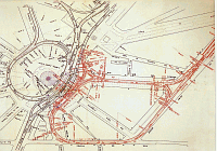 Züge werden entlang der Strecke geparkt und setzen direkt von dort ein. Der Plan zeigt die Schleifenanlage noch vor dem Bau der Linie 6; auffällig, wie die Strecken in den nicht bebauten Bereich eingepasst wurden.